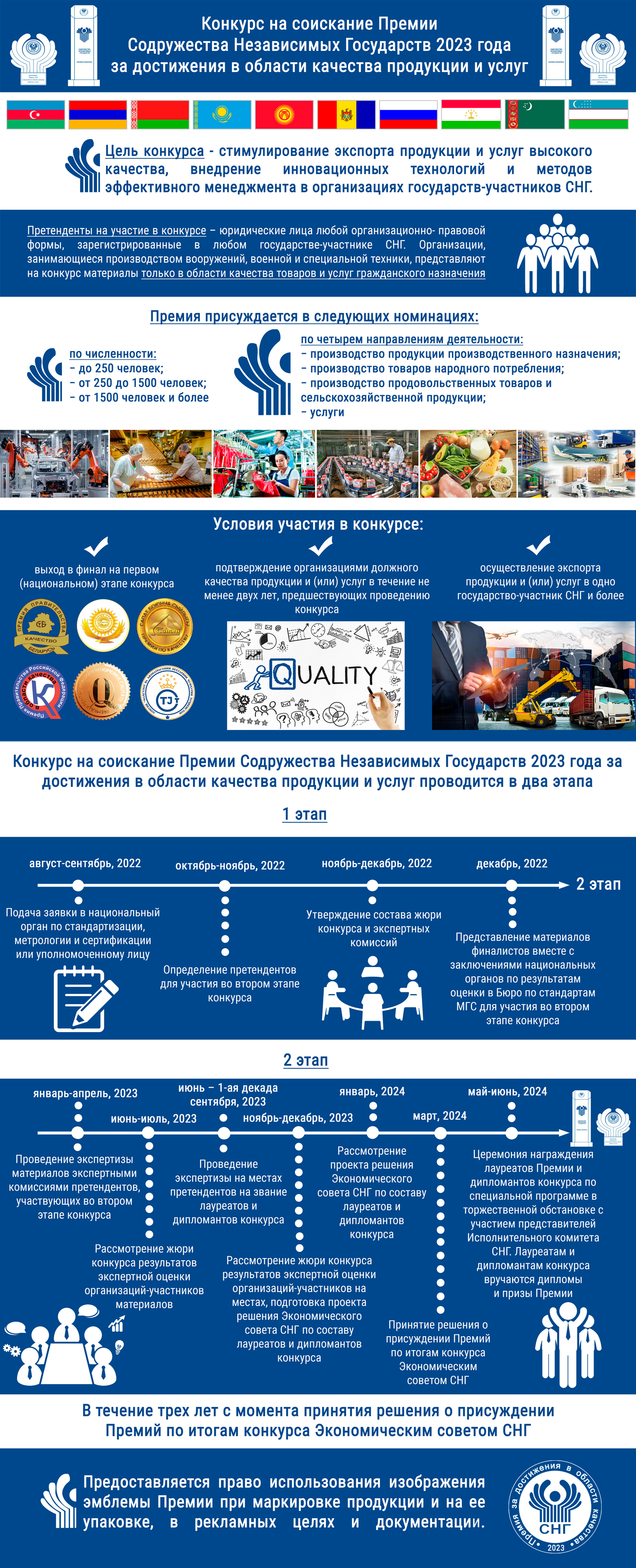 Решение о конкурсе на соискание Премии Содружества Независимых Государств 2025 года за достижения в области качества продукции и услуг принято на 65-м заседании Межгосударственного совета по стандартизации, метрологии и сертификации, состоявшемся 20-21 июня 2024 года.