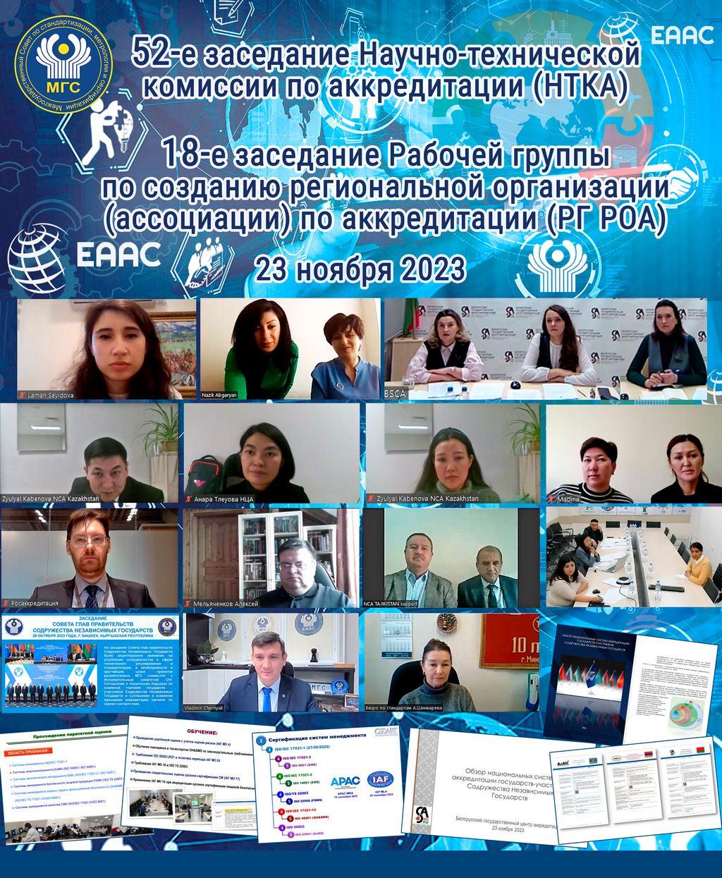 23 ноября 2023 года в режиме видеоконференции состоялись 52-е заседание Научно-технической комиссии по аккредитации (НТКА) и 18-е заседание Рабочей группы по созданию Региональной организации (ассоциации) по аккредитации (РГ РОА) Межгосударственного совета по стандартизации, метрологии и сертификации.