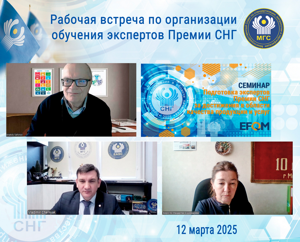 12 марта 2025 года в рамках подготовки к предстоящему обучению экспертов конкурса на соискание Премии Содружества Независимых Государств 2025 года за достижения в области качества продукции и услуг состоялась рабочая встреча Бюро по стандартам с директором АНО «Центр экспертных программ ВОК», членом Правления Всероссийской организации качества Сафоновым Анатолием Александровичем.