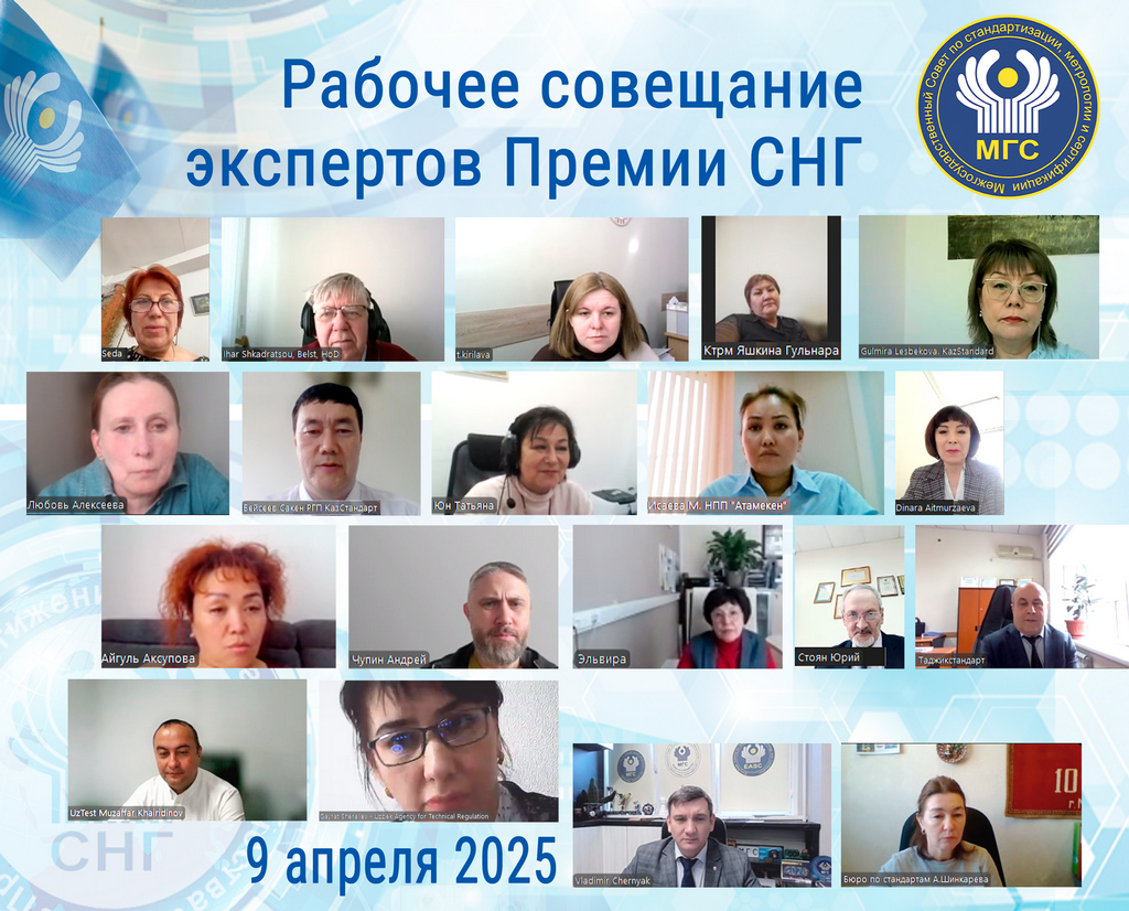 9 апреля 2025 состоялось четырнадцатое рабочее совещание экспертов Премии СНГ по обсуждению составляющих критериев присуждения Премии СНГ за достижения в области качества продукции и услуг в рамках доработки проекта документа «Методика оценки деятельности организаций на соответствие критериям Премии СНГ». Совещание было организовано Бюро по стандартам, в соответствии с рекомендацией, выработанной участниками рабочего совещания, состоявшегося 14 марта 2025.