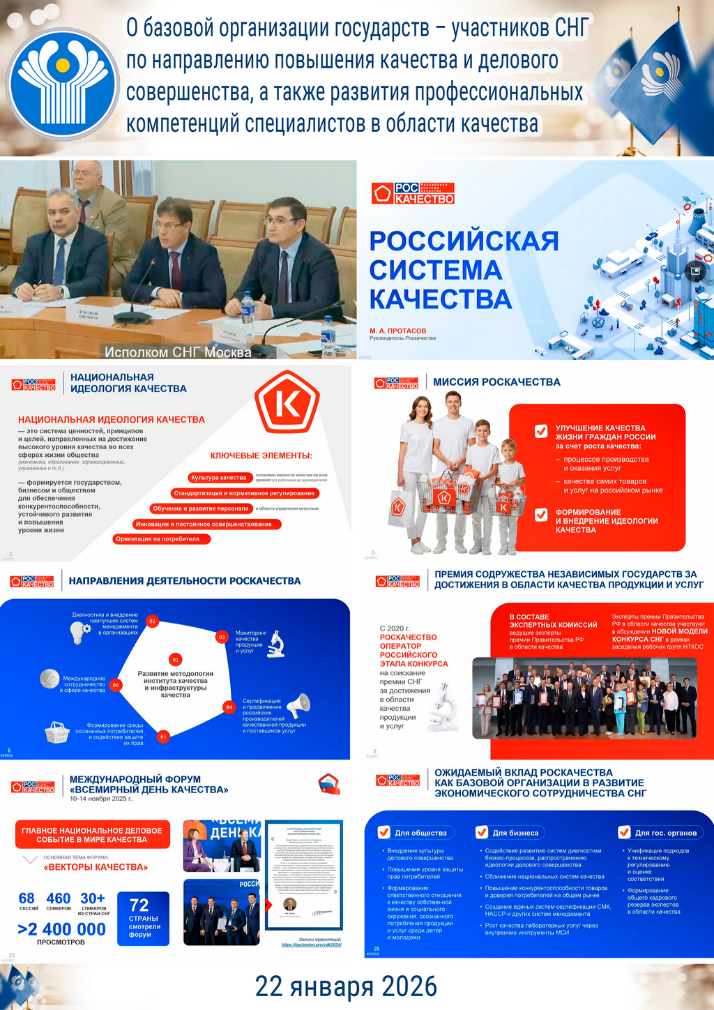 Вопрос повестки «О базовой организации государств – участников Содружества Независимых Государств по направлению повышения качества и делового совершенства, а также развития профессиональных компетенций специалистов в области качества» был представлен руководителем автономной некоммерческой организации «Российская система качества» Протасовым Максимом Александровичем. Протасов М.А. проинформировал участников заседания о направлениях деятельности Роскачества, а также о готовности сотрудничества по данным направлениям со странами СНГ в качестве базовой организации.