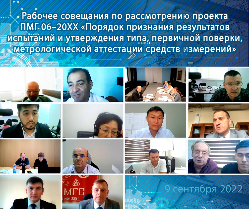 В соответствии с пунктом 7 протокола 55-го заседания Научно-технической комиссии по метрологии от 8 июня 2022 (протокол НТКМетр № 55-2022) с целью рассмотрения проекта ПМГ 06–20ХХ «Порядок признания результатов испытаний и утверждения типа, первичной поверки, метрологической аттестации средств измерений» 9 сентября 2022 г. проведено рабочее совещание в формате видеоконференции с участием представителей национальных органов по метрологии Азербайджанской Республики, Республики Армения, Республики Беларусь, Республики Казахстан, Кыргызской Республики, Российской Федерации, Республики Узбекистан и Бюро по стандартам.