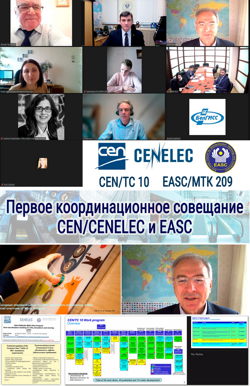 18 февраля 2022 года между CEN/СENELEC и МГС состоялась онлайн встреча по координации взаимодействия между CEN/СENELEC и МГС в части реализации пилотного проекта Соглашения между CEN/СENELEC и МГС в области «Лифты, эскалаторы и траволаторы».