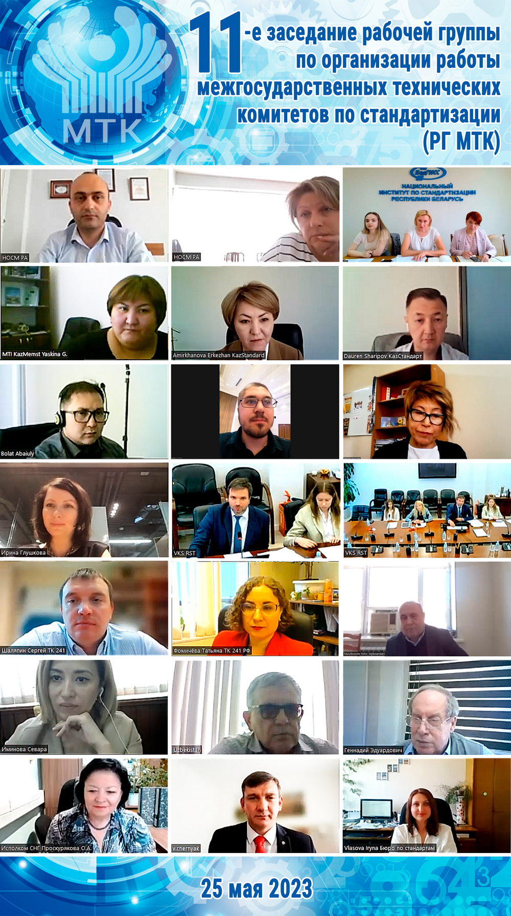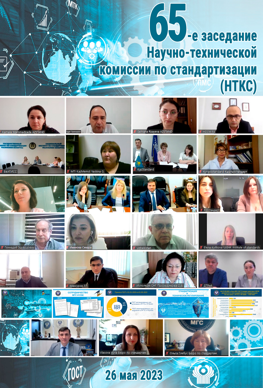 C 25 по 26 мая 2023 в формате видеоконференции состоялись 11-е заседание Рабочей группы по организации работы МТК (РГ МТК) и 65-е заседание Научно-технической комиссии по стандартизации (НТКС) Межгосударственного совета по стандартизации, метрологии и сертификации организованные Бюро по стандартам.