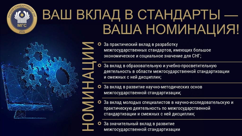 - за вклад молодых специалистов в научно-исследовательскую и практическую деятельность по межгосударственной стандартизации и смежных с ней дисциплин,