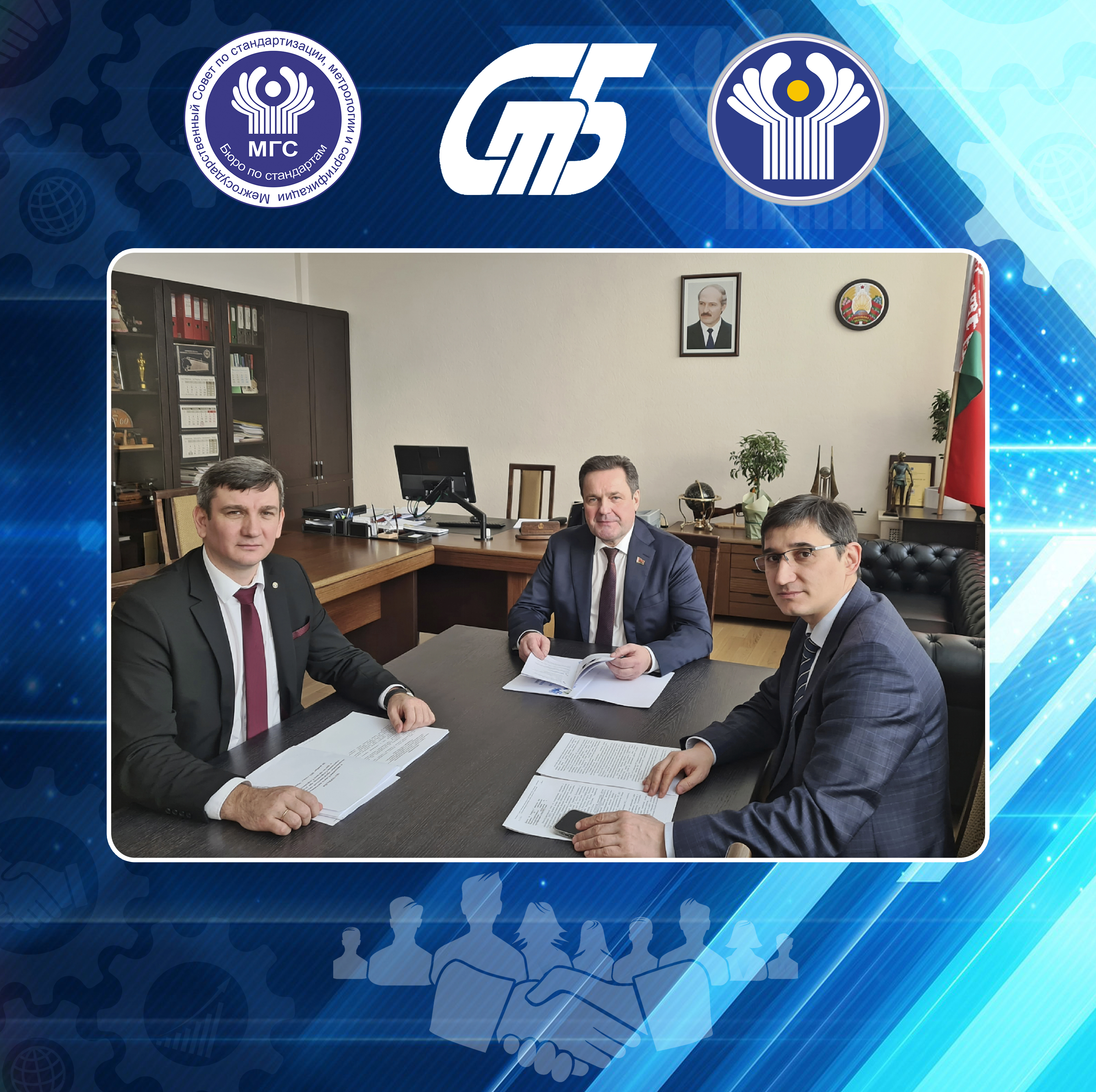30 ноября 2023 состоялась рабочая встреча Председателя МГС - Председателя Государственного комитета по стандартизации Республики Беларусь ТАТАРИЦКГО Валентина Болеславовича с ответственным по взаимодействию ИК СНГ и МГС – начальником отдела научно-технического сотрудничества и инноваций Департамента экономического сотрудничества ИК СНГ МАНСУРОВЫМ Тимуром Тиллоевичем и Ответственным секретарём МГС – директором Бюро по стандартам ЧЕРНЯКОМ Владимиром Николаевичем.