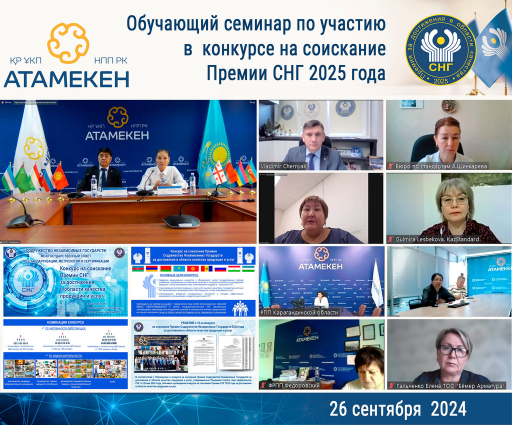 26 сентября 2024 года в режиме видеоконференции по инициативе Национальной палаты предпринимателей Республики Казахстан «Атамекен» состоялся обучающий семинар для сотрудников Региональной палаты предпринимателей «Атамекен» и представителей предприятий, желающих принять участие в конкурсе на соискание Премии Содружества Независимых Государств за достижения в области качества продукции и услуг 2025 года, в рамках подготовки к предстоящим мероприятиям конкурса.