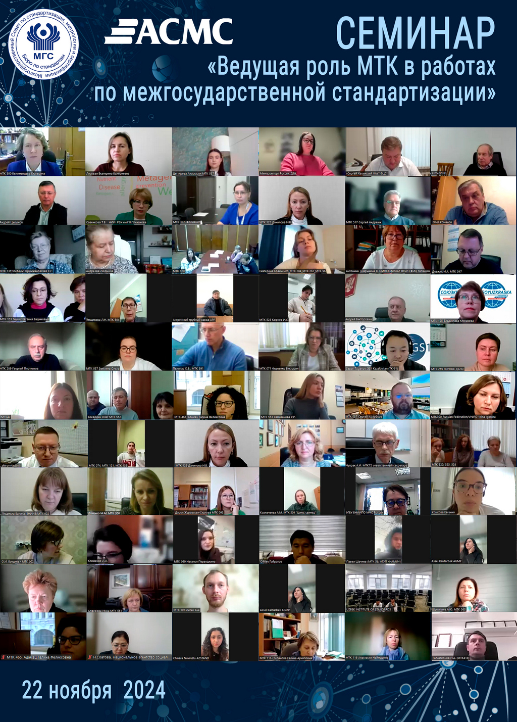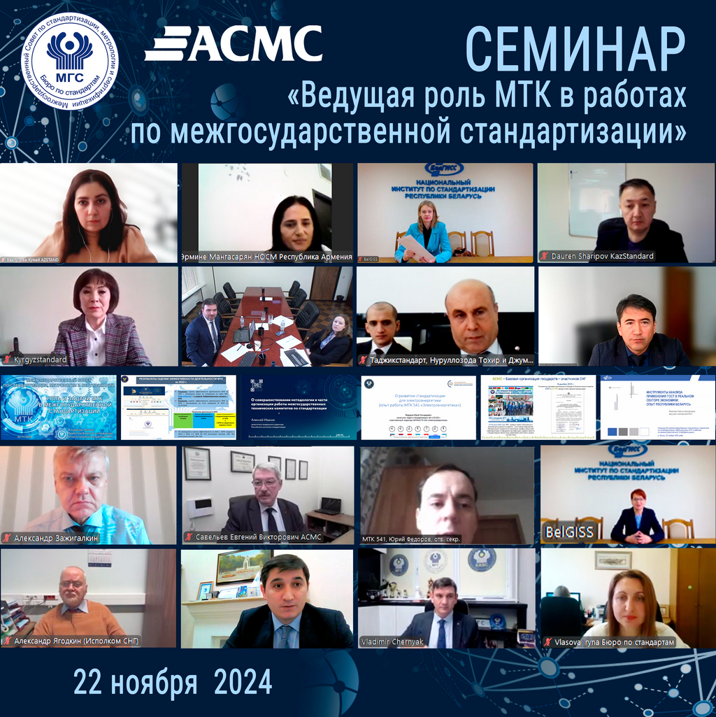 22.11.2024 состоялся семинар «Ведущая роль МТК в работах по межгосударственной стандартизации» для межгосударственных технических комитетов по стандартизации (МТК), организованный Базовой организацией государств – участников СНГ по подготовке, профессиональной переподготовке, повышению квалификации кадров в области стандартизации, метрологии, управления качеством и оценки соответствия совместно с Бюро по стандартам и МТК 536 «Методология межгосударственной стандартизации» в рамках выполнения п. 14.2 протокола заседания МГС № 65-2024 от 21.06.2024.