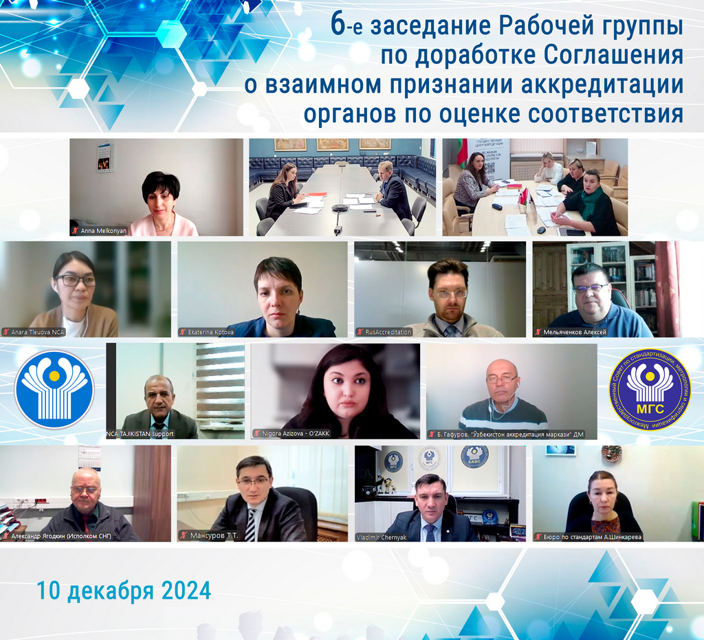 10 декабря 2024 года в режиме видеоконференции состоялось 6-е заседание Рабочей группы по доработке Соглашения о взаимном признании аккредитации органов по оценке соответствия (РГ ВПА) Межгосударственного совета по стандартизации, метрологии и сертификации.
