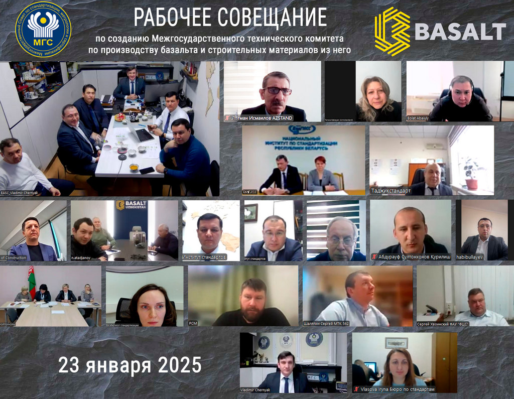В соответствии с п. 7.4.3 протокола МГС № 66-2024 с целью обсуждения возможного создания нового МТК «Базальт и изделия из него» 23 января 2025 года состоялось рабочее совещание с участием представителей от национальных органов и институтов по стандартизации, Межгосударственных технических комитетов по стандартизации (МТК), а также Бюро по стандартам.