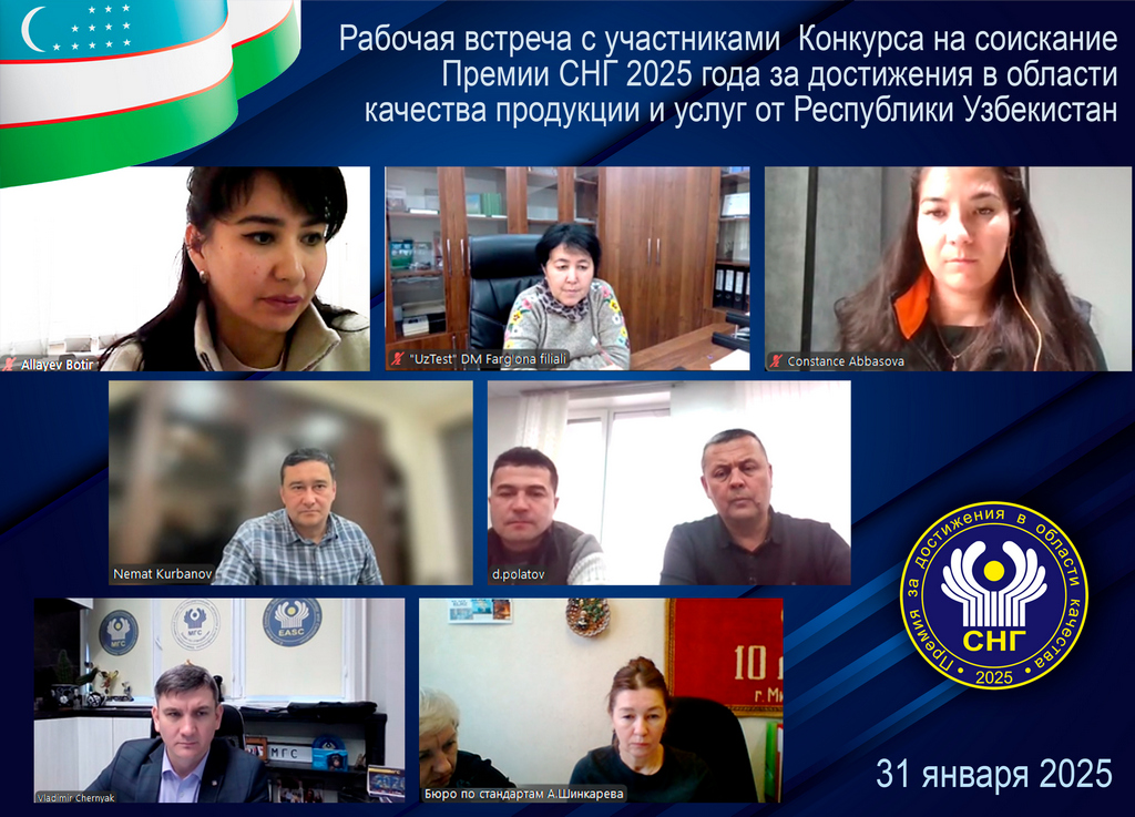 31 января 2025 года в режиме видеоконференции при поддержке Узбекского агентства по техническому регулированию при Кабинете Министров Республики Узбекистан состоялась встреча участников конкурса на соискание Премии Содружества Независимых Государств 2025 года за достижения в области качества продукции и услуг от Республики Узбекистан и Бюро по стандартам.